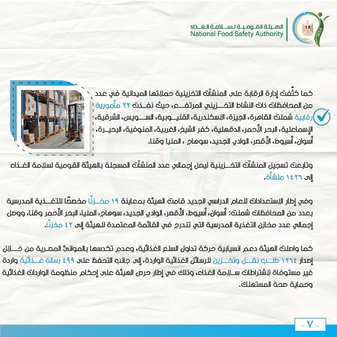 وتابعت تسجيل المنشآت التخزينية ليصل إجمالي عدد المنشآت المسجلة بالهيئة القومية لسلامة الغذاء إلى 1426 منشأة.