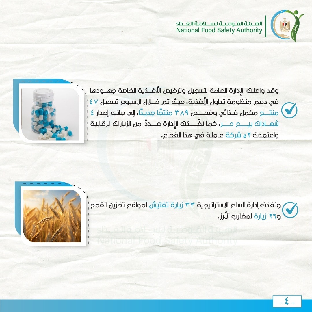 وواصلت الإدارة العامة لتسجيل وترخيص الأغذية الخاصة جهودها في دعم منظومة تداول الأغذية، حيث تم خلال الاسبوع تسجيل 47 منتج مكمل غذائي وفحص 389 منتجًا جديدًا، إلى جانب إصدار 4 شهادات بيع حر، كما نفّذت الإدارة عددًا من الزيارات الرقابية واعتمدت 52 شركة عاملة في هذا القطاع.