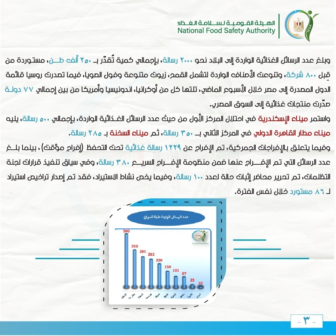 وبلغ عدد الرسائل الغذائية الواردة إلى البلاد نحو 2000 رسالة، بإجمالي كمية تُقدّر بــ 250 ألف طن، مستوردة من قِبل 800 شركة، وتنوعت الأصناف الواردة لتشمل القمح، زيوت متنوعة وفول الصويا، فيما تصدرت روسيا قائمة الدول المصدرة إلى مصر خلال الأسبوع الماضي، تلتها كل من أوكرانيا، اندونيسيا وأمريكا من بين إجمالي 77 دولة صدّرت منتجات غذائية إلى السوق المصري.