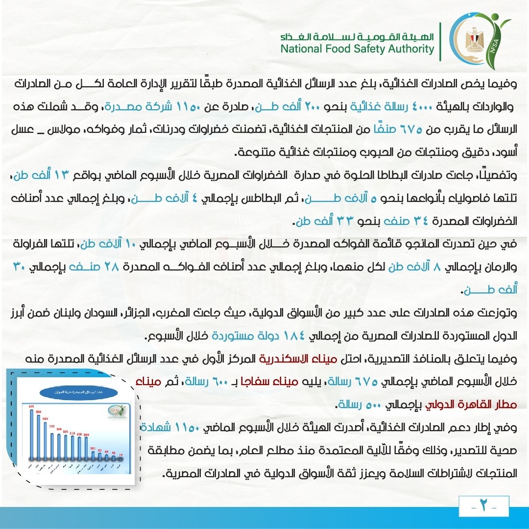 وفيما يخص الصادرات الغذائية، بلغ عدد الرسائل الغذائية المصدرة طبقًا لتقرير الإدارة العامة لكل من الصادرات والواردات بالهيئة 4000 رسالة غذائية بنحو 200 ألف طن، صادرة عن 1150 شركة مصدرة، وقد شملت هذه الرسائل ما يقرب من 675 صنفًا من المنتجات الغذائية، تضمنت خضراوات ودرنات، ثمار وفواكه، مولاس _ عسل أسود، دقيق ومنتجات من الحبوب ومنتجات غذائية متنوعة.