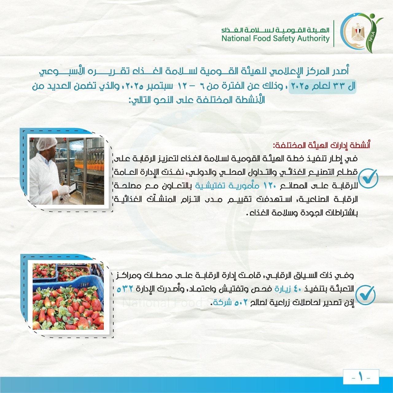 أصدر المركز الإعلامي للهيئة القومية لسلامة الغذاء تقريره الأسبوعي الـ 33 لعام 2025، وذلك عن الفترة من 6 - 12 سبتمبر، وتضمن العديد من الأنشطة المختلفة .