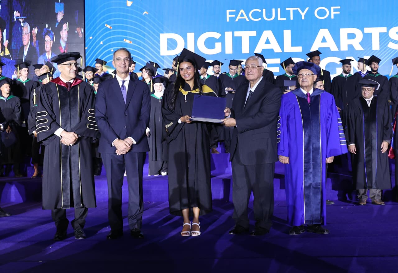 كذلك قام المستشار/ عدلى منصور، والدكتور/ عمرو طلعت بتكريم أوائل كليات علوم الحاسب والمعلومات، وتكنولوجيا الأعمال، والفنون الرقمية والتصميم.