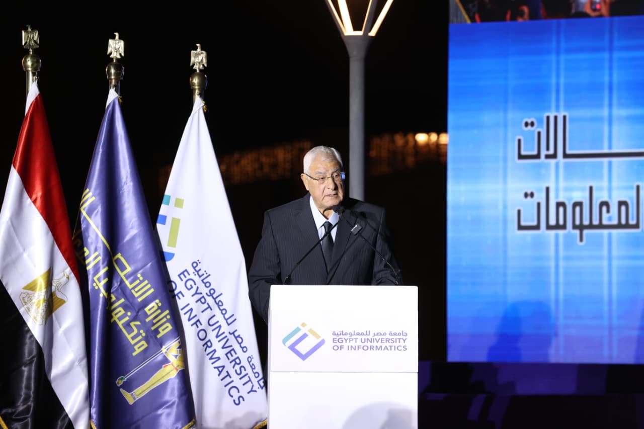 وفى كلمته خلال الاحتفالية؛ أكد المستشار عدلى منصور رئيس جمهورية مصر العربية السابق ورئيس مجلس الأمناء المؤسس لجامعة مصر للمعلوماتية أن الجامعة تمثل صرحًا علميًا وُلد من رؤية طموحة وإيمان حقيقى بضرورة هذا النوع من التعليم المتميز، مهنئًا خريجى الدفعة الأولى من الجامعة على ما حققوه من إنجاز عظيم، متمنيًا لهم التوفيق فى حياتهم العملية القادمة، حيث ينتقلون من قاعات الدراسة إلى ساحات العمل محملين بالعلم والمعرفة التى اكتسبوها خلال دراستهم المتميزة فى مجالات تخصصية.