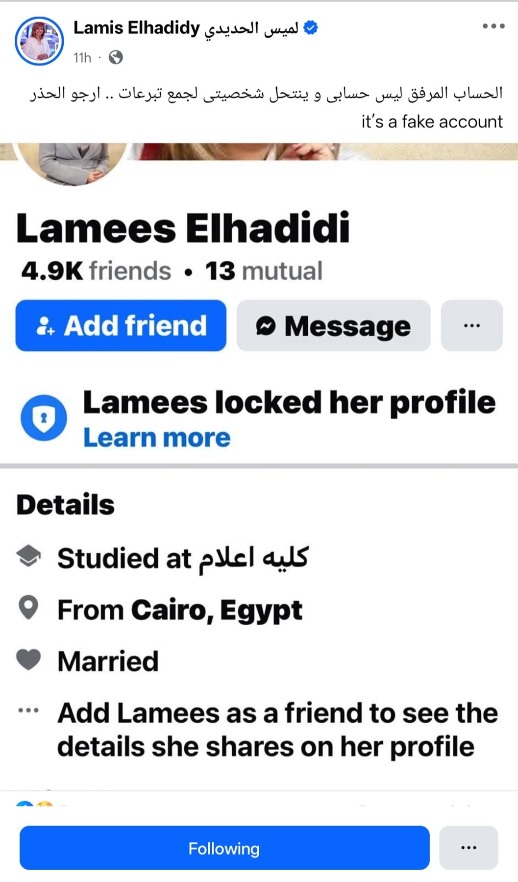 وكتبت لميس الحديدي من خلال حسابها الرسمي عبر موقع التواصل الاجتماعي "فيسبوك"، قالت:" الحساب المرفق ليس حسابي وينتحل شخصيتي لجمع تبرعات.. أرجو الحذر، it’s a fake account".