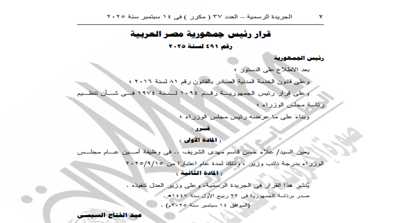 أصدر السيد الرئيس عبد الفتاح السيسى القرار رقم 491 لسنة 2025، بتعيين علاء حسن قاسم مهدى الشريف، فى وظيفة أمين عام مجلس الوزراء بدرجة نائب وزير ، وذلك لمدة عام اعتبارًا من 15-9-2025.