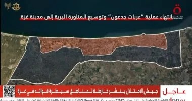 نشر جيش دولة الاحتلال الإسرائيلي قبل قليل، خارطة لمناطق سيطرة قواته فى قطاع غزة، جاء ذلك وفقا لما أفادت به قناة القاهرة الإخبارية فى خبر عاجل لها قبل قليل.