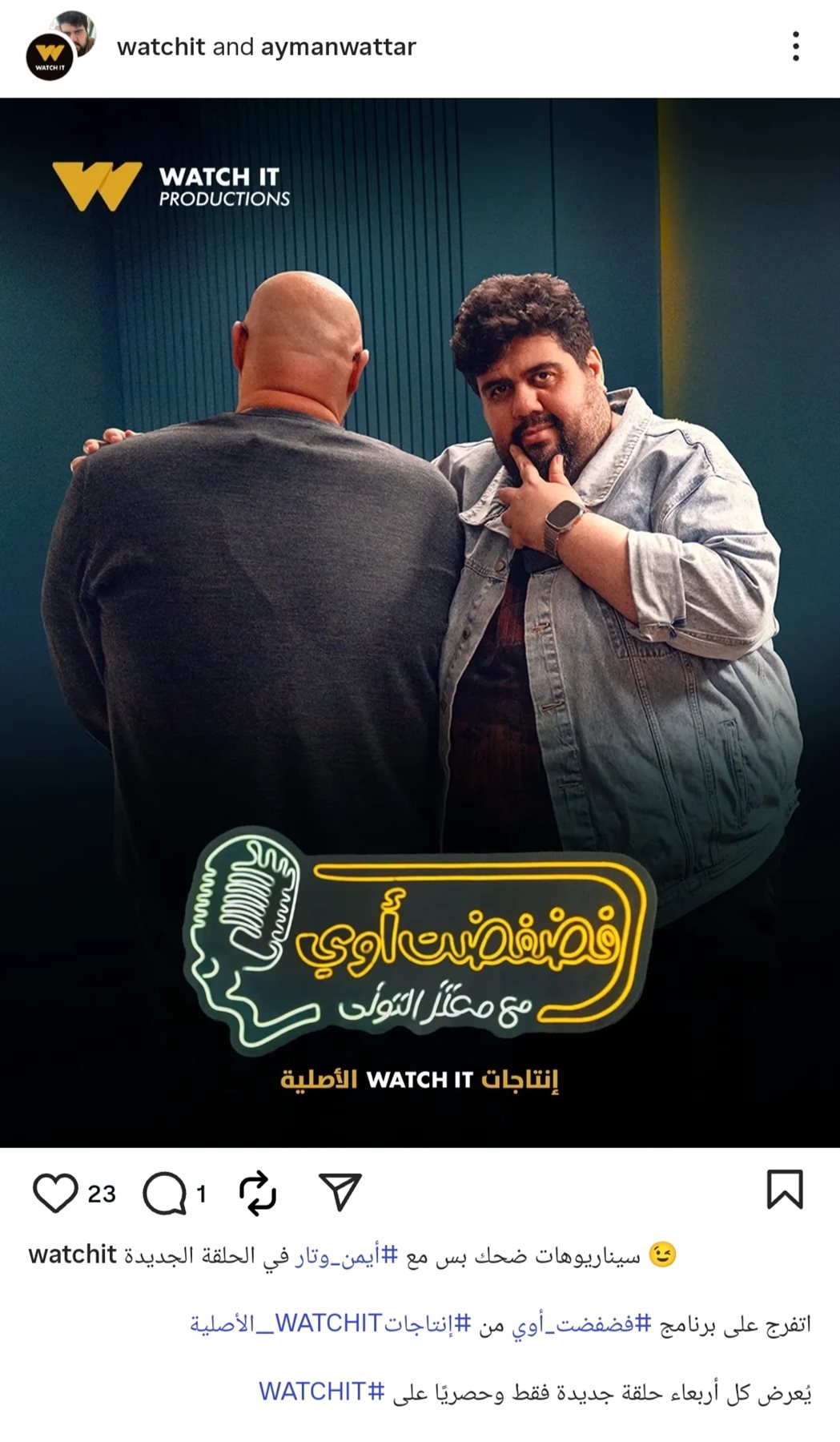 يحل الفنان والمؤلف أيمن وتار ضيفاً على برنامج "فضفضت أوى"، الذى يقدمه المخرج معتز التونى، على منصة Watch it الرقمية، أحدث إنتاجاتها الأصلية، غداً الأربعاء، وسيحمل اللقاء مواقف كوميدية وحكايات طريفة عن حياته سواء فى حياته العملية او الخاصة.