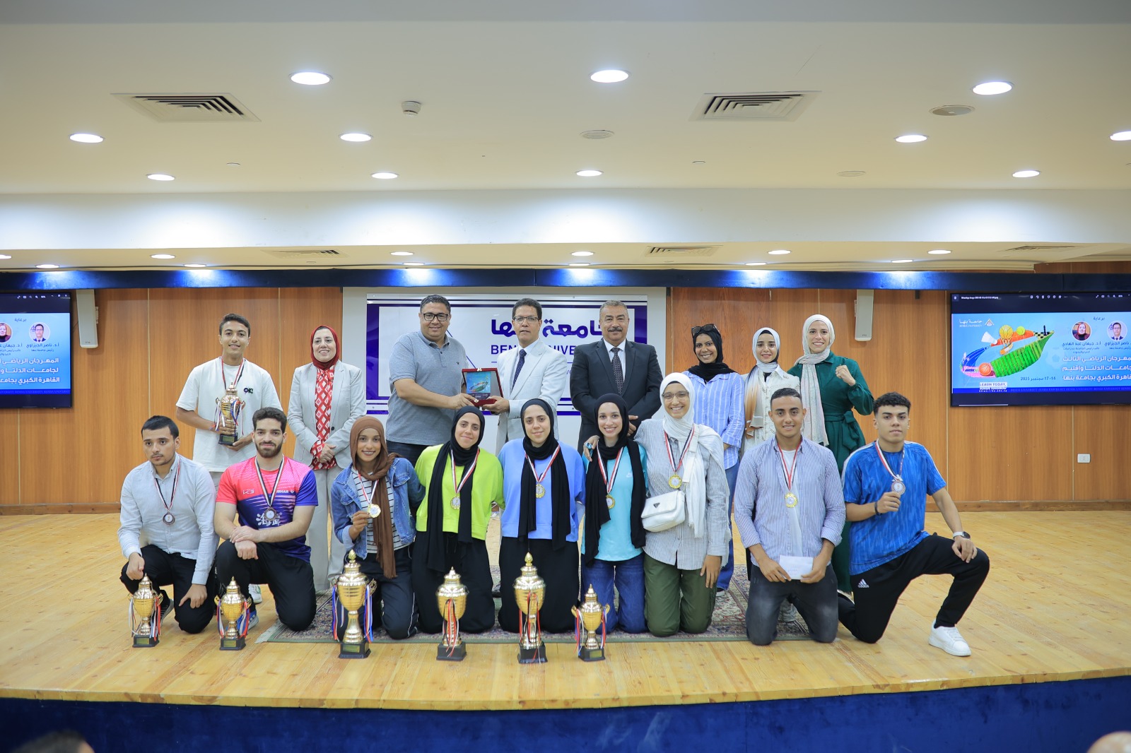 جاء ذلك بحضور الدكتورة جيهان عبد الهادى نائب رئيس جامعة بنها لشئون الدراسات العليا والبحوث، والدكتور وليد طلعت القائم بعمل عميد كلية العلاج الطبيعي ، والدكتور خالد عيسوى منسق عام الأنشطة الطلابية بالجامعة والدكتور هانى زكريا المشرف على الملاعب.