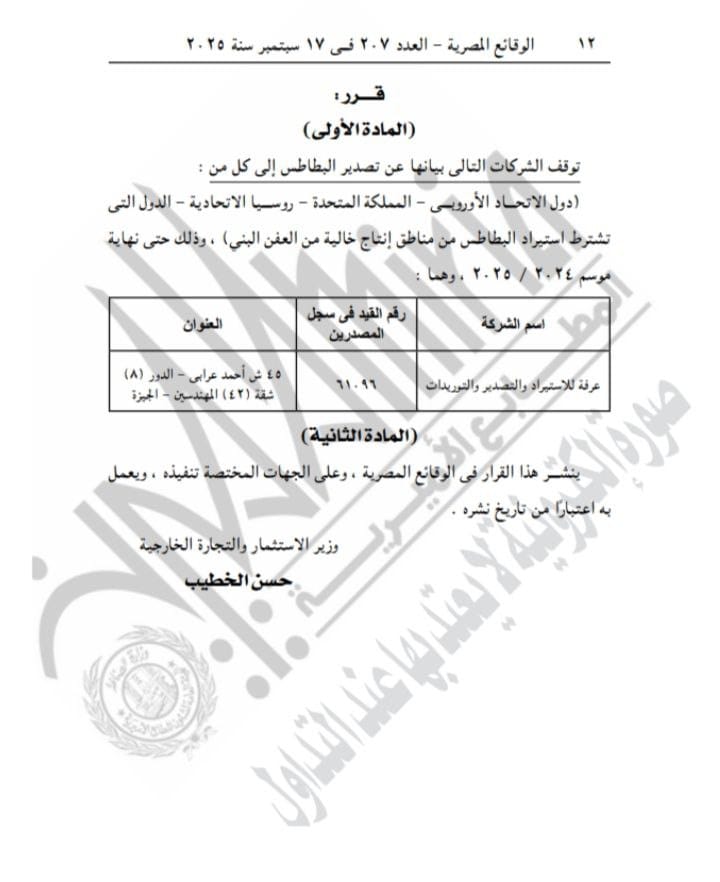 وأضافت وزارة الزراعة أن هذه الشركة المذكورة في القرار، من حقها تصدير المحصول في الموسم الجديد، في حال التزامها بالاشتراطات، وليس وقفا دائما.