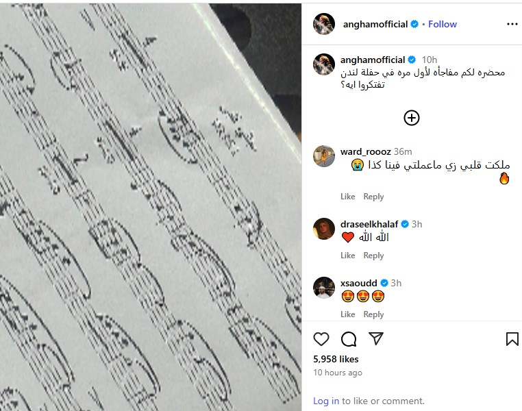 وكتبت أنغام من خلال حسابها الرسمي عبر موقع تبادل الصور والفيديوهات القصيرة "إنستجرام"، قالت: "محضرة لكم مفاجأة لأول مرة في حفلة لندن.. تفتكروا ايه؟".