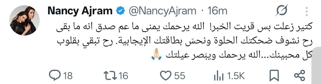 وكتبت نانسي عجرم عبر موقع التواصل الاجتماعي "إكس" تويتر سابقًا: "كتير زعلت بس قريت الخبر.. الله يرحمك يمنى ما عم صدق انه ما بقى رح نشوف ضحكتك الحلوة، ونحس بطاقتك الإيجابية، رح تبقي بقلوب كل محبينك.. الله يرحمك ويصبر عيلتك".