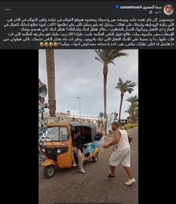و ردت سما المصري رد ساخرًا على المطعنى، من خلال منشور مدعوم بفيديو عبر حسابها الرسمي عبر موقع التواصل الاجتماعي "فيسبوك"، قالت:"حوسحوس كان فكر نفسه جامد وبرمشه عين وتسبيله وبعشوه هيوقع العوالم في غرامه واهي العوالم في الاخر هي اللي ركبته الزوجليقه ولزعتك علي قفاك.. رسايل ايه يابو رسايل اللي عايز تطلعها ؟؟انت كبيرة تطلع لسانك للعيال في الشارع ذي الاهبل ويركبوك الحمار بالشقلوب.. فاكر هتقل ادبك واسكتلك؟ هتقل ادبك تاني همسح بوشك الإسفلت..مش مكسوف وانت طالع تقول للناس العالمه علمت عليك؟؟انا رديت عليك اهو بطريقه العالمه اللي انت قلت عليها.. دا رد بسيط علي كلامك الاهبل اللي ذيك.. وطير انت باه عشان الناس تضحك.. اللي هيقولي مين دا هاعمل له اعلان عقارات ببلاش..عيب كده يا جماعه معندكوش اخوات عوالم؟؟".