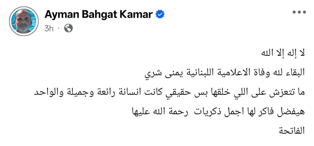 وكتب أيمن بهجت قمر من خلال حسابه الرسمي عبر موقع التواصل الاجتماعي "فيسبوك"، قال: "لاإله إلا الله.. البقاء لله وفاة الإعلامية اللبنانية يمنى شري.. ما تتعزش على اللي خلقها بس حقيقي كانت إنسانية رائعة وجميلة، الواحد هيفضل فاكر لها أجمل ذكريات.. رحمة الله عليها.. الفاتحة".