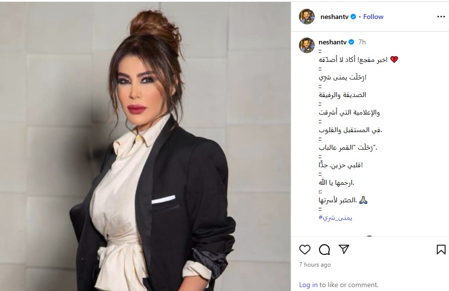 نيشان يودع الإعلامية الراحلة يمنى شري برسالة حزينة