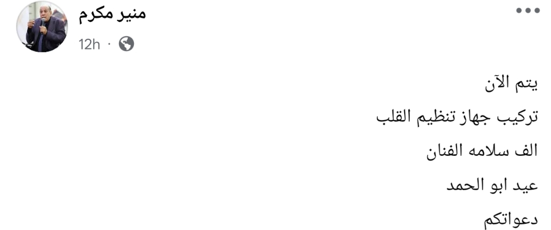 وكتب منير مكرم من خلال حسابه الرسمي عبر موقع التواصل الاجتماعي "فيسبوك"، قال:"يتم الآن تركيب جهاز تنظيم القلب.. ألف سلامة الفنان عيد أبو الحمد.. دعواتكم".