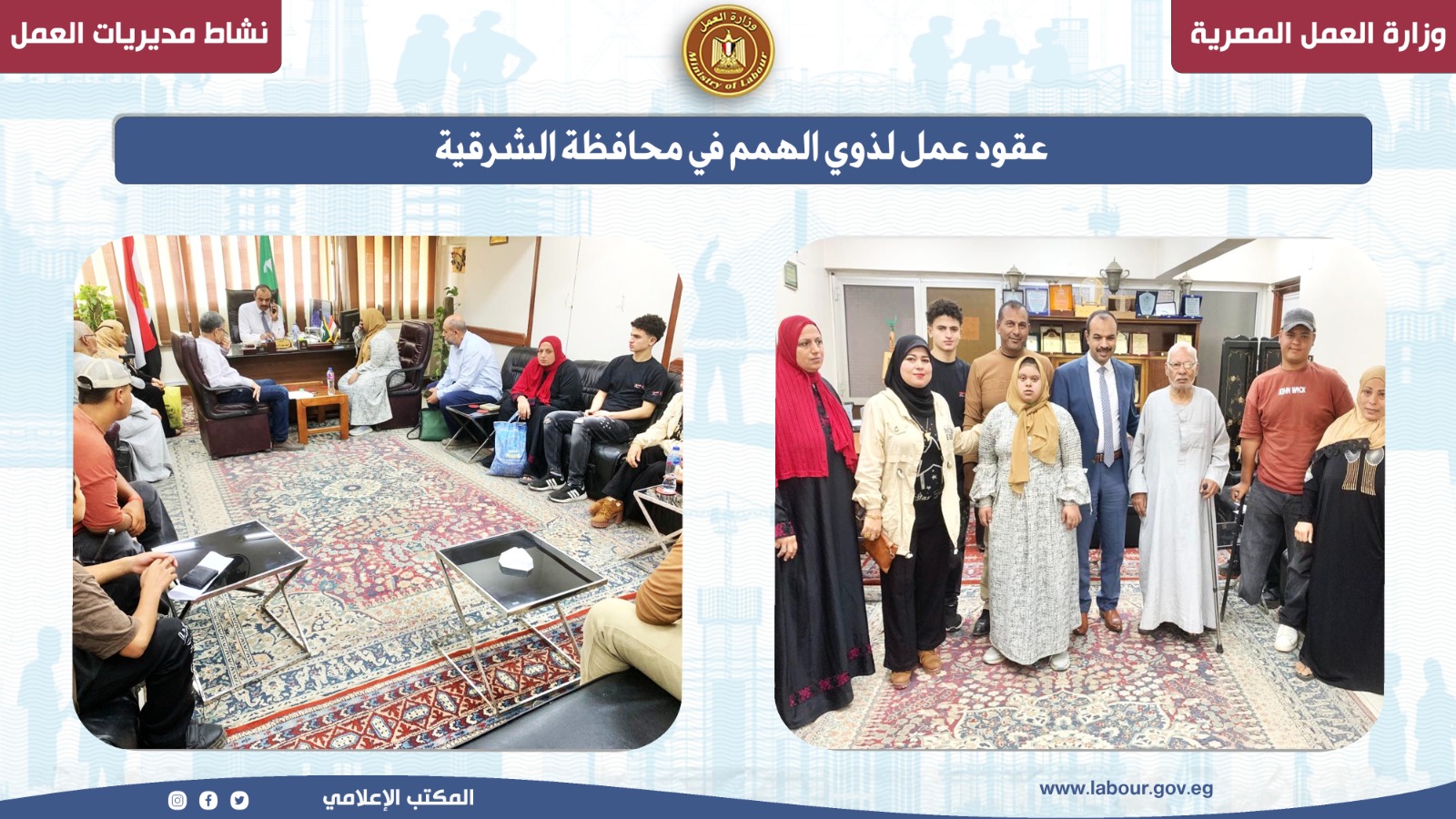 استقبل أحمد عبد الهادي مدير مديرية العمل بالشرقية، عددًا من راغبي العمل من ذوي الهمم، وذلك بمقر الديوان العام للمديرية، في إطار متابعة حثيثة لمطالبهم وتذليل المعوقات التي تواجههم في سوق العمل، والعمل على توفير فرص عمل لائقة تتناسب مع ظروفهم في القطاع الخاص.