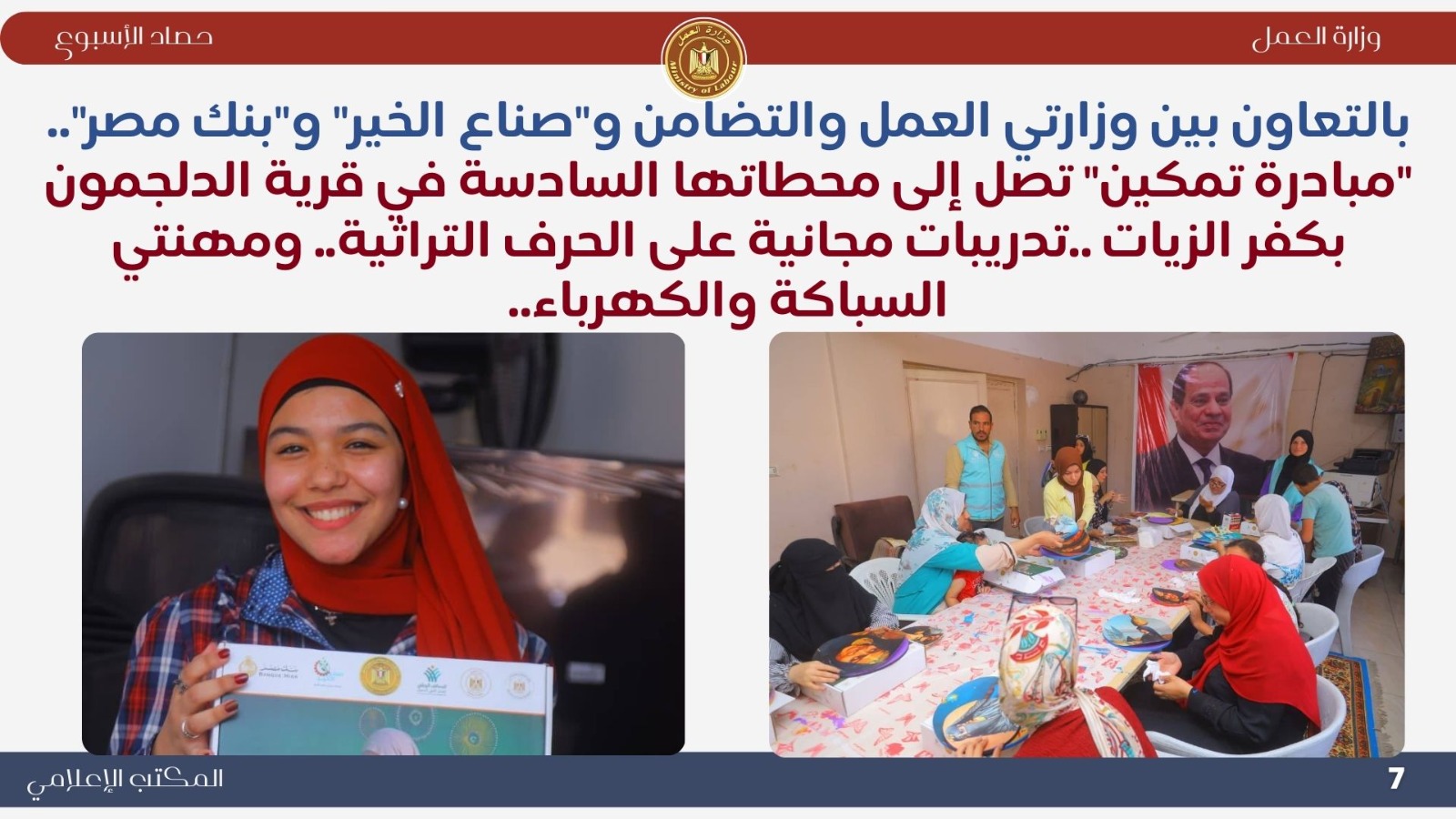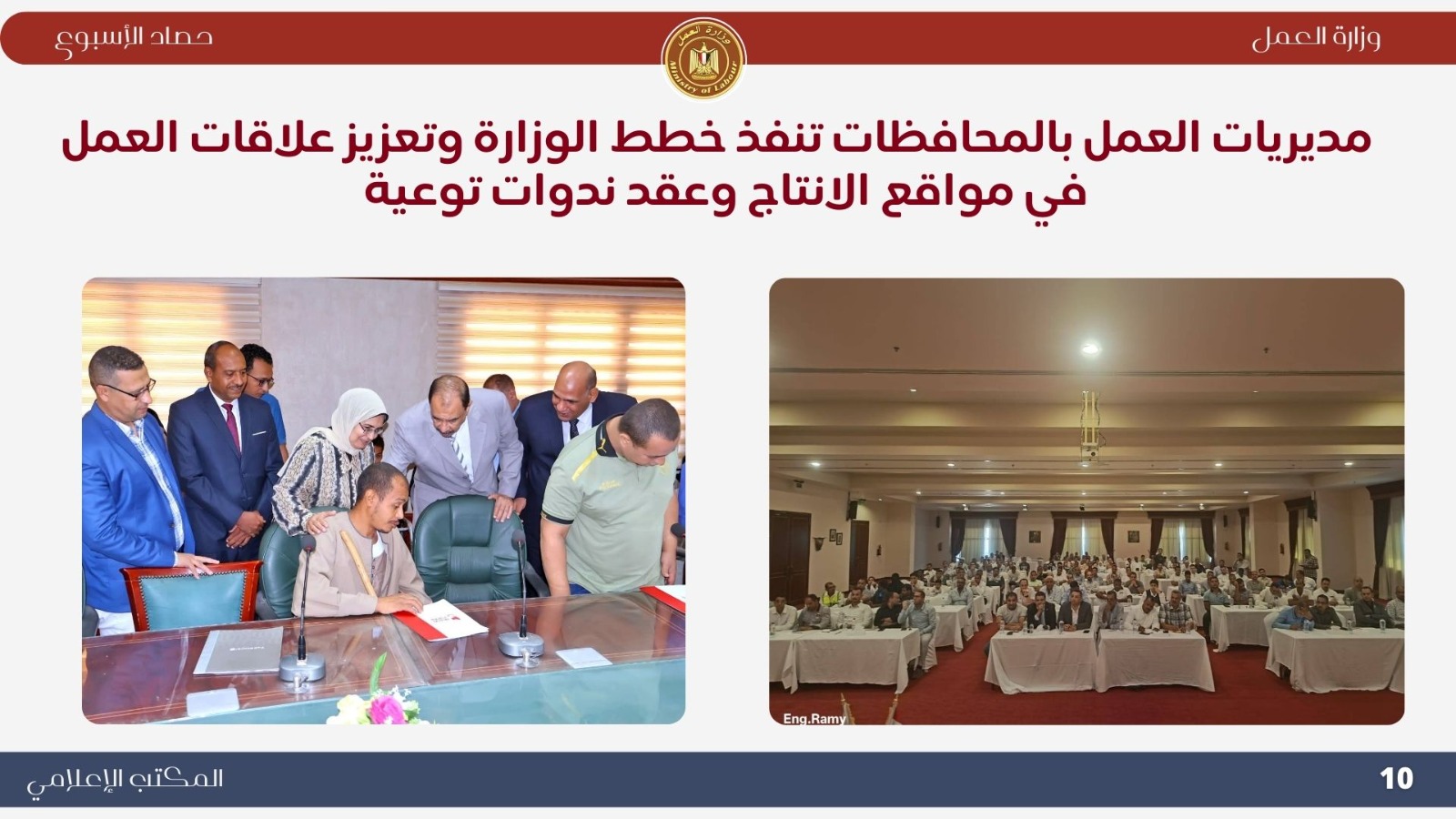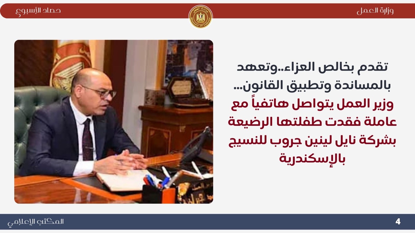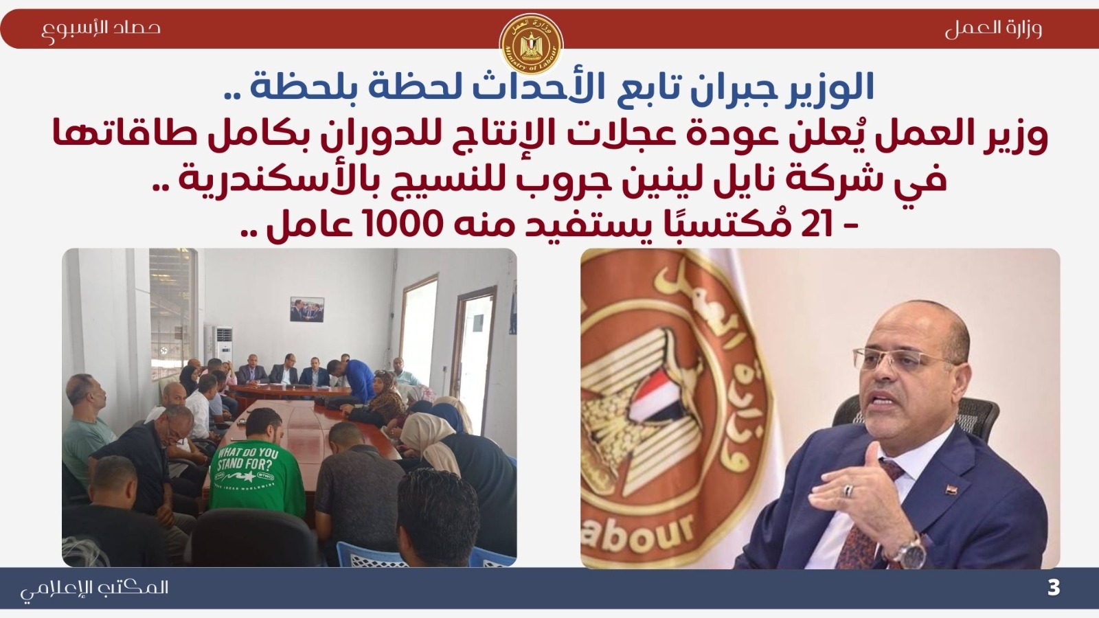نشرت وزارة العمل اليوم الجمعة "انفوجراف" يوضح نشاط "الوزارة" خلال أسبوع ..خلال هذا الأسبوع أعلن وزير العمل السيد محمد جبران ، عن عودة عجلات الإنتاج إلى الدوران بكامل طاقاتها ، في شركة نايل لينين جروب للنسيج والمفروشات بالمنطقة الحرة بالعامرية بالإسكندرية، بعد مفاوضات جماعية ناجحة نظمتها "الوزارة" مع الإدارة والعمال "1000 عامل"،لتنفيذ المطالب العمالية المشروعة ، وكذلك تطبيق القانون بشأن واقعة فقدان العاملة دعاء أحمد عطيفي،طفلتها الرضيعة ابنة الثلاثة أشهر التي توفيت على ذراعها.