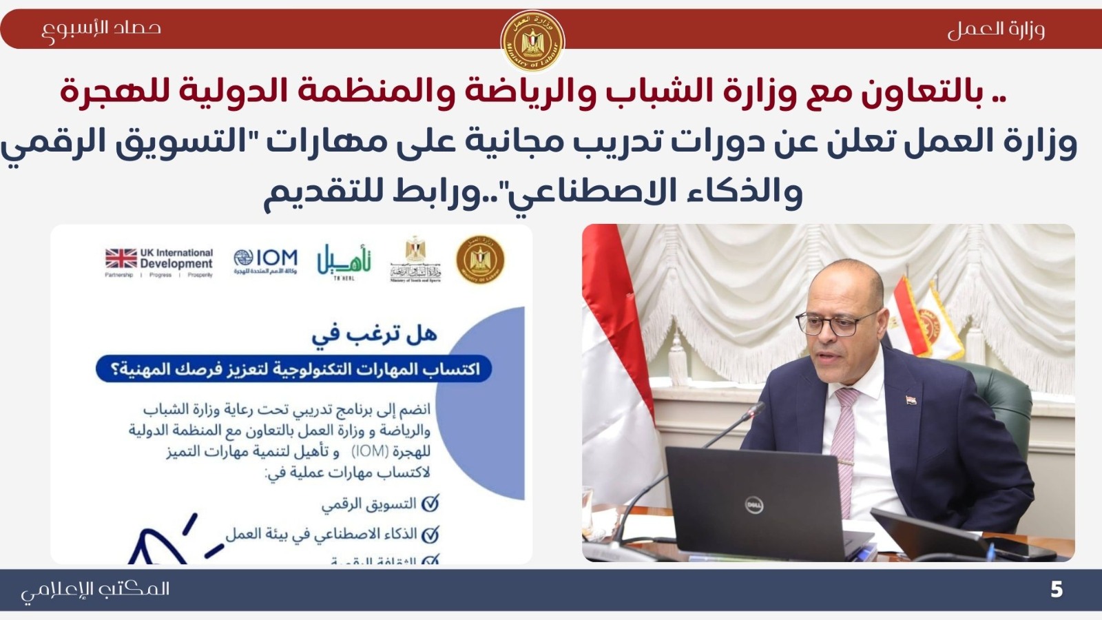 ..وتنفيذًا لتوجيهات وزير العمل السيد /محمد جبران بتنمية مهارات الشباب على متطلبات سوق العمل في الداخل والخارج ،أعلنت وزارة العمل ،عن فتح باب التقديم أمام الشباب ، للاستفادة من برنامج تدريبي مجاني، وذلك تحت رعاية وزارتي الشباب والرياضة، والعمل، بالتعاون مع المنظمة الدولية للهجرة (IOM Egypt) و Taheal ، وذلك للتأهيل ولتنمية المهارات على تخصصات التسويق الرقمي، بتعلّم أساسيات صناعة المحتوى وتصميم الحملات الإعلانية عبر منصات التسويق الرقمي،والذكاء الاصطناعي، بتطوير المهام وتوفير الوقت في بيئة العمل،و أنه في حال عدم القدرة على اجتياز متطلبات أي من الدورتين، يمكن الالتحاق بدورة تمهيدية في الثقافة الرقمية، لتعلّم أساسيات استخدام الكمبيوتر والإنترنت بأمان وكفاءة.