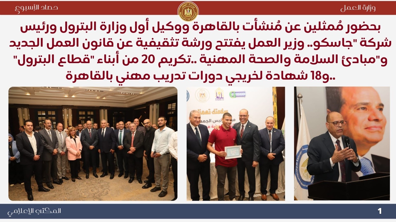 وحاضر السيد الشرقاوي مدير عام الإدارة العامة للتفتيش،وكيل مديرية عمل القاهرة، عن "قانون العمل" ،كما ألقى المهندس خالد عبد الله، مستشار وزير العمل للسلامة والصحة المهنية ، محاضرة عن أهمية نشر ثقافة السلامة والصحة المهنية للحفاظ على صحة العامل ،وسلامة أدوات الإنتاج.