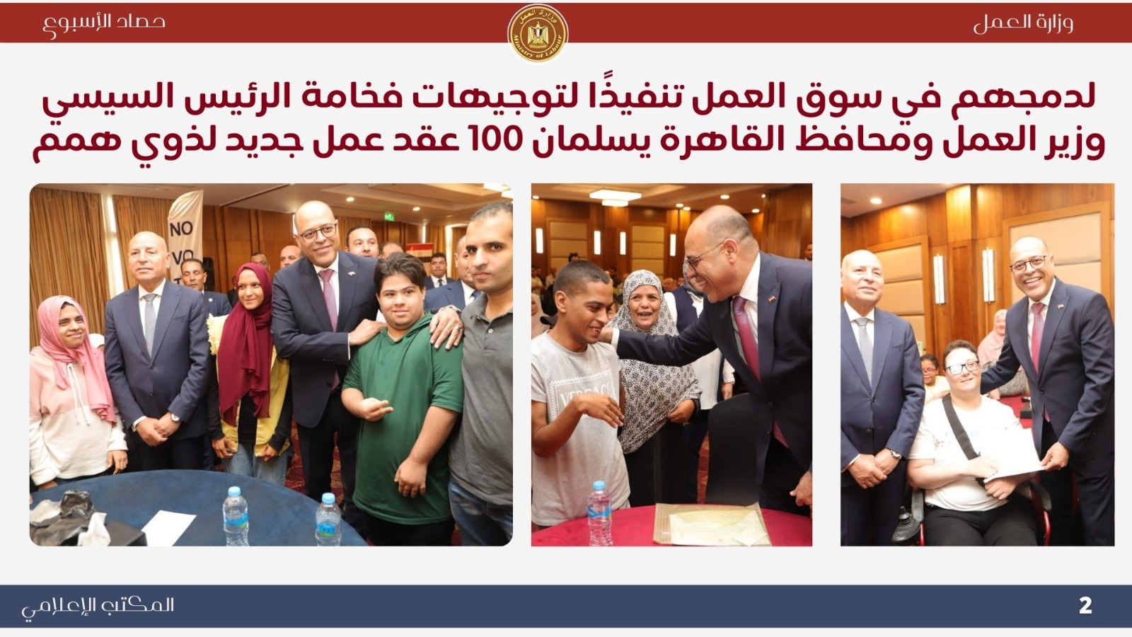 وتؤكد وزارة العمل أنها تتابع عن كثب أوضاع العمالة المصرية بالخارج، وتحرص على حماية حقوقهم والتنسيق مع الجهات المعنية لحل المشكلات التي قد تواجههم.كما سلم وزير العمل محمد جبران، والدكتور إبراهيم صابر محافظ القاهرة، أمس الخميس ، 100 عقد عمل جديد لذوى همم من أبناء المحافظة، للعمل فى منشآت بالقطاع الخاص، وذلك لدمجهم فى سوق العمل تنفيذًا لتوجيهات فخامة الرئيس عبدالفتاح السيسى رئيس الجمهورية، جاء ذلك خلال احتفالية نظمتها مديرية عمل القاهرة برئاسة السيد الشرقاوى، بأحد فنادق القاهرة .