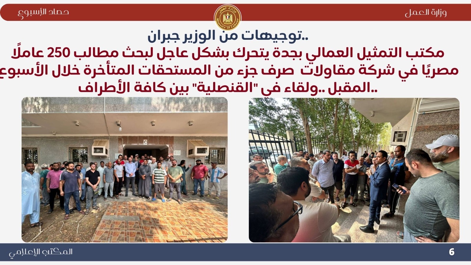 كما أنه تنفيذًا لتوجيهات وزير العمل السيد محمد جبران، قام الملحق العمالي بالقنصلية المصرية بجدة، السيد محمد حسن، بزيارة مقر إحدى شركات المقاولات بمكة المكرمة بالمملكة العربية السعودية، للوقوف على مطالب 250 عاملًا مصري بالشركة ،والتي تتمثل في تأخر صرف الرواتب بعد توقف الشركة منذ شهرين ،إلى جانب بعض المطالب الإجتماعية الأخرى.