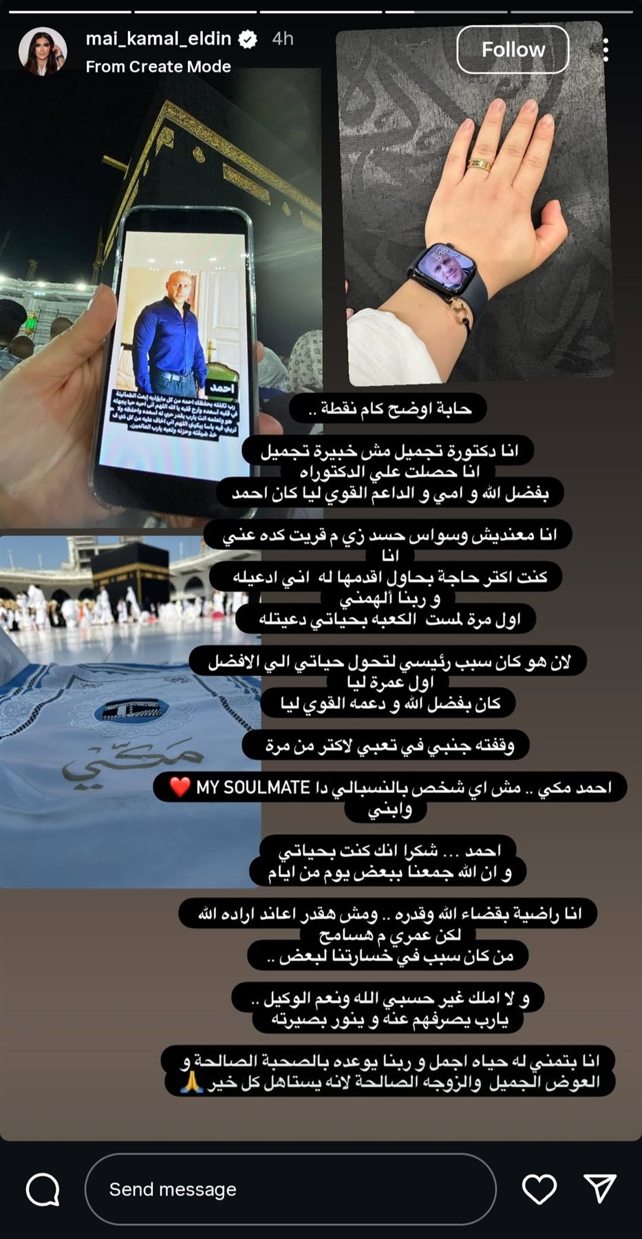 تابعت: "لأن هو كان سبب رئيسي لتحول حياتي إلي الافضل.. أول عمرة ليا كان بفضل الله ودعمه القوي ليا.. وقفته جنبي في تعبي أكتر من مرة".