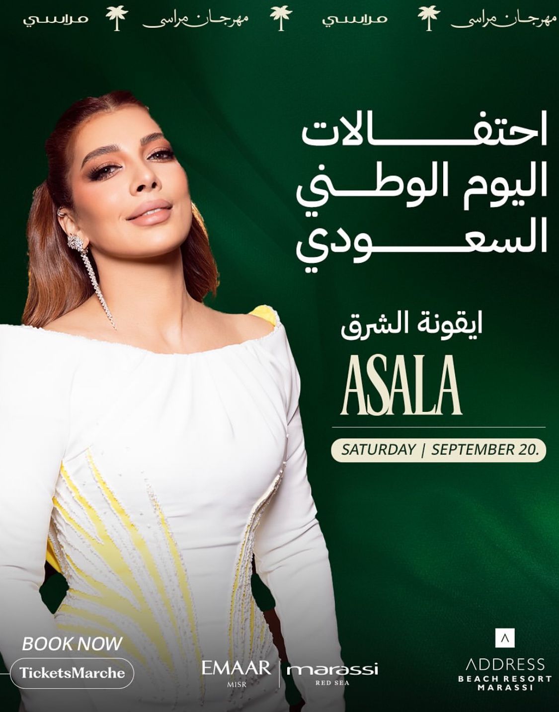 تحيي النجمة أصالة، والنجم أحمد سعد، حفلًا اليوم ، احتفالًا باليوم الوطني السعودي، ضمن فعاليات مهرجان مراسي "ليالي مراسي"، والذي يقام برعاية مراسي البحر الأحمر.