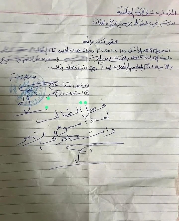 وعلى الفور، قررت إدارة المدرسة تطبيق أحكام اللائحة الطلابية، بفصل الطالب لمدة أسبوع كامل، مع استدعاء ولي أمره، للتأكيد على ضرورة الالتزام والانضباط داخل المدرسة، في رسالة واضحة بأن العام الدراسي يبدأ بالانضباط أولًا.
