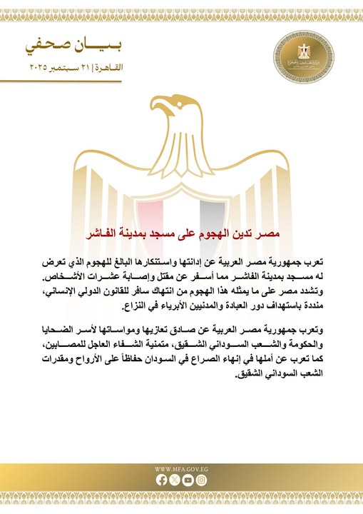 تعرب جمهورية مصر العربية عن إدانتها واستنكارها البالغ للهجوم الذي تعرض له مسجد بمدينة الفاشر مما أسفر عن مقتل وإصابة عشرات الأشخاص.