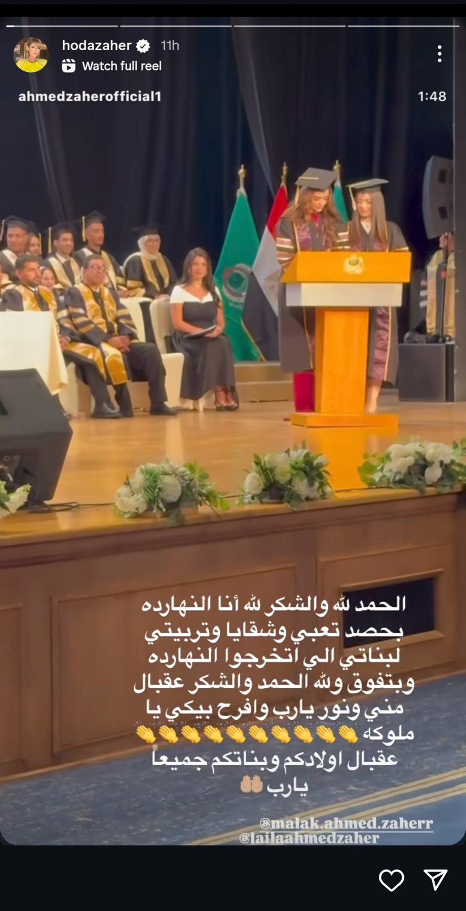 وكتبت من خلال حسابها الرسمي عبر موقع تبادل الصور والفيديوهات القصيرة إنستجرام، وكتبت: "الحمد لله والشكر لله النهاردة بحصد تعبي وشقايا في تربيتي لبناتي اللي اتخرجوا النهاردة وبتفوق كمان، ولله الحمد والشكر وعقبال مني ونور، ويارب افرح بيكي ياملوكة".