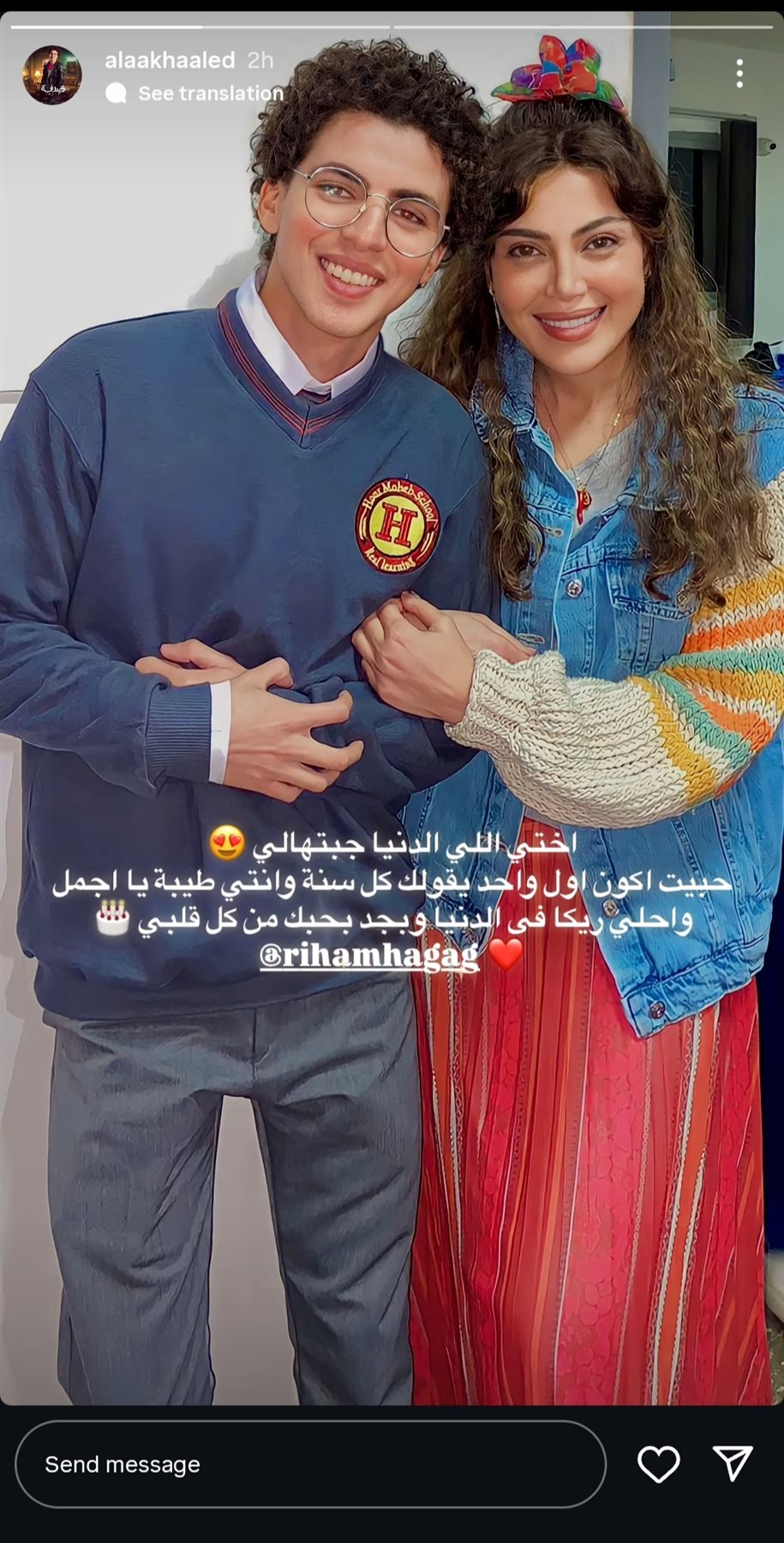 ووجه علاء خالد رسالة لـ ريهام حجاج، حيث نشر صورة تجمعهما، من خلال حسابه الرسمي عبر موقع تبادل الصور والفيديوهات القصيرة إنستجرام، عبر خاصية ستوري، وكتب: "أختي اللي الدنيا جابتهالي.. حبيت أكون أول واحد يقولك كل سنة وأنتي طيبة يا أجمل وأحلى ريكا في الدنيا وبجد بحبك من كل قلبي".
