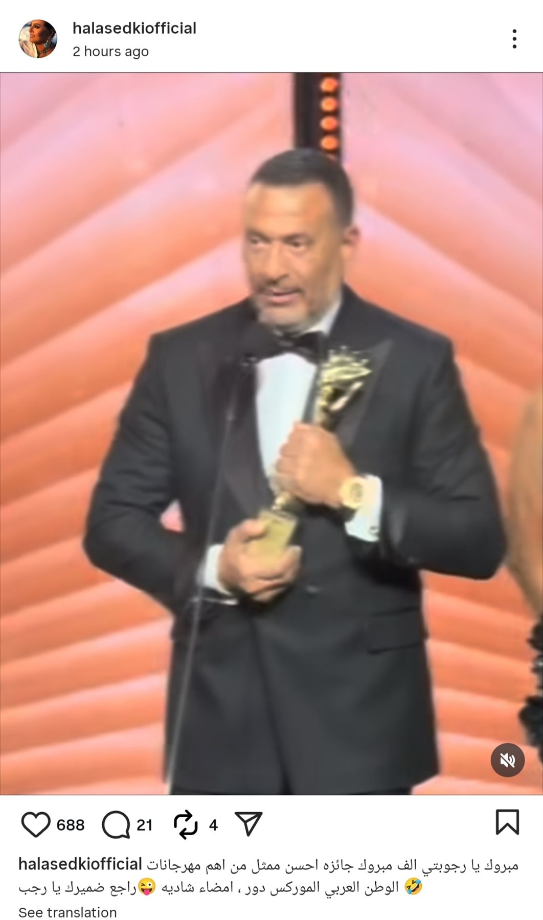 ونشرت هالة صدقي صورة لـ ماجد المصري أثناء حفل التكريم، من خلال حسابها الرسمي عبر موقع تبادل الصور والفيديوهات القصيرة إنستجرام، وكتبت: "مبروك يا رجوبتي.. ألف مبروك جائزة أحسن ممثل من أهم مهرجانات الوطن العربي الموركس دور، إمضاء شادية.. راجع ضميرك يا رجب".