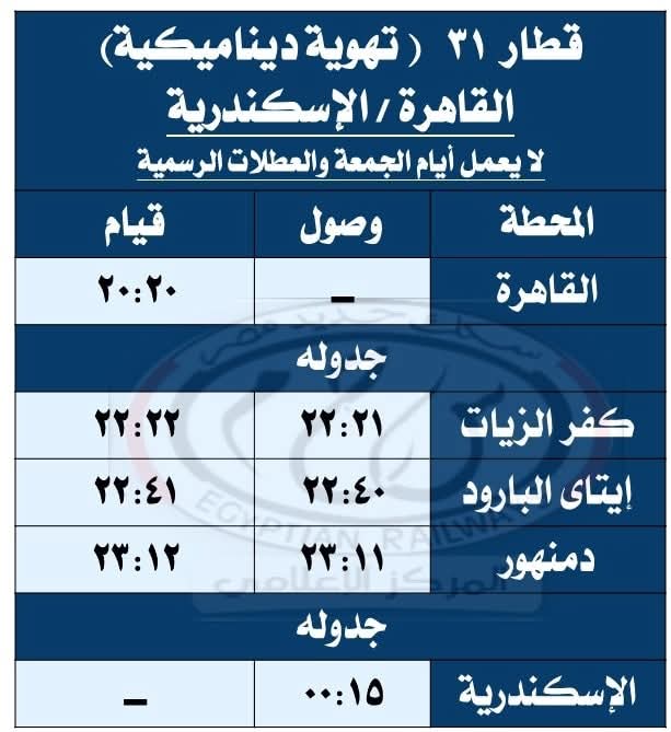 حيث تقرر اعتباراً من يوم السبت الموافق 27 / 9 / 2025 تشغيل قطار 930 ( ثانية فاخرة ) من القاهرة إلى أسيوط حيث يقوم من محطة القاهرة الساعة 08:30 ويصل أسيوط الساعة 13:20 طبقاً للجدول المرفق ، على أن يعود بقطار 929 ( ثانية فاخرة ) حيث يقوم من محطة أسيوط الساعة 13:40 ويصل القاهرة محطة القاهرة الساعة 18:30 طبقاً للجدول المرفق .