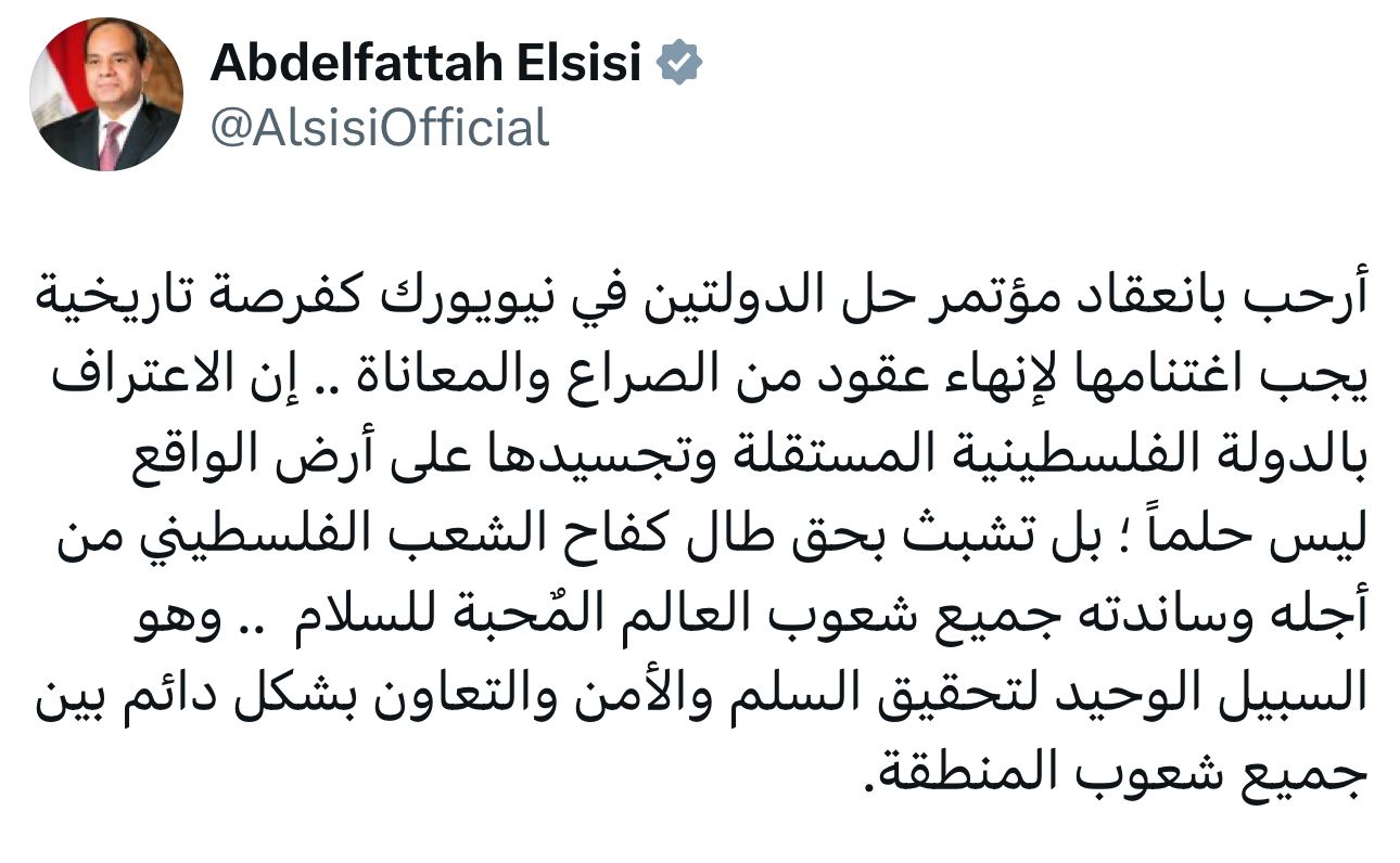 رحب الرئيس عبد الفتاح السيسي بانعقاد مؤتمر حل الدولتين في نيويورك، واصفًا إياه بـالفرصة التاريخية التي يجب اغتنامها لإنهاء عقود من الصراع والمعاناة في المنطقة.
