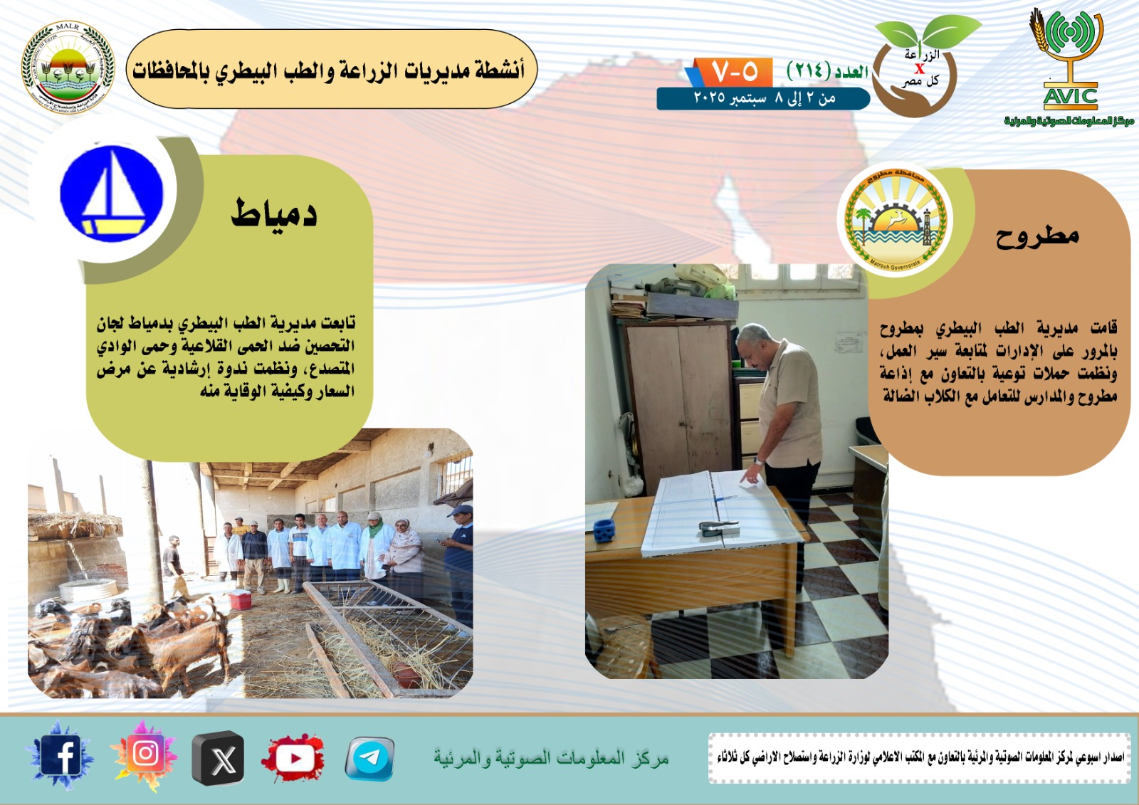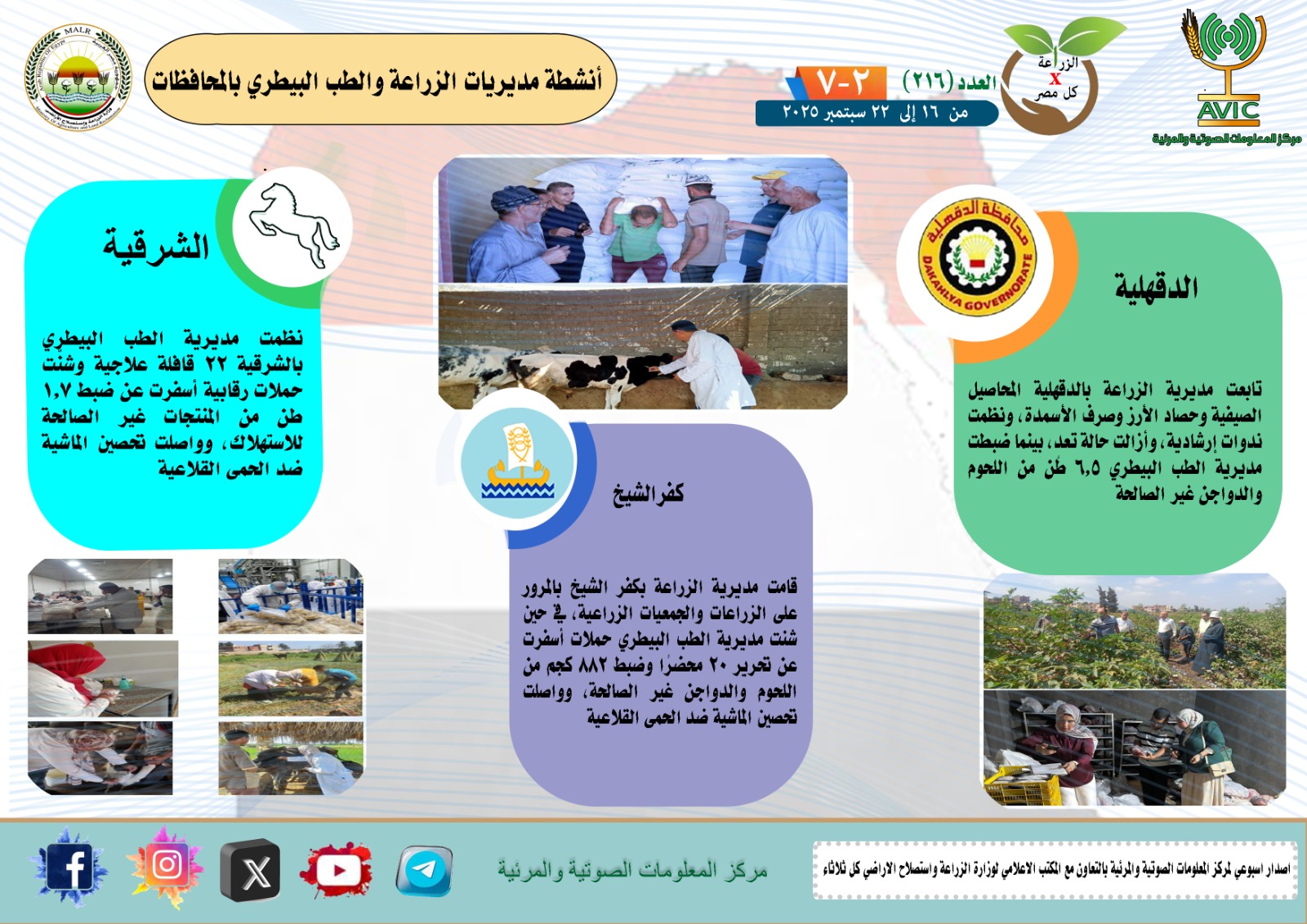 ونظمت مديرية الطب البيطري بالغربية 55 ندوة إرشادية للتوعية بأهمية تحصين الماشية ضد الحمى القلاعية وحمى الوادي المتصدع، والوقاية من الأمراض المشتركة، كما تابعت مديرية الزراعة بالمنوفية عمليات جني القطن، وأزالت 32 حالة تعدٍ على الأراضي الزراعية، بينما نفذت مديرية الطب البيطري قافلة علاجية مجانية استفاد منها مئات الحيوانات والطيور، كما قامت مديرية الزراعة بكفر الشيخ بالمرور على الزراعات والجمعيات الزراعية، في حين شنت مديرية الطب البيطري حملات أسفرت عن تحرير 20 محضرًا وضبط 882 كجم من اللحوم والدواجن غير الصالحة، وواصلت تحصين الماشية ضد الحمى القلاعية، و تابعت مديرية الزراعة بالدقهلية المحاصيل الصيفية وحصاد الأرز وصرف الأسمدة، ونظمت ندوات إرشادية، وأزالت حالة تعدٍ، بينما ضبطت مديرية الطب البيطري 6.5 طن من اللحوم والدواجن غير الصالحة، كما نظمت مديرية الطب البيطري بالشرقية 22 قافلة علاجية وشنّت حملات رقابية أسفرت عن ضبط 1.7 طن من المنتجات غير الصالحة للاستهلاك، وواصلت تحصين الماشية ضد الحمى القلاعية.