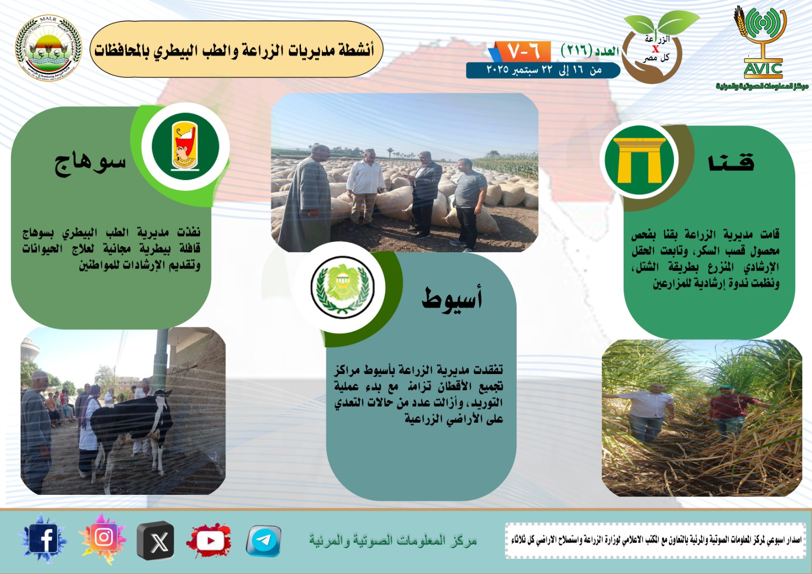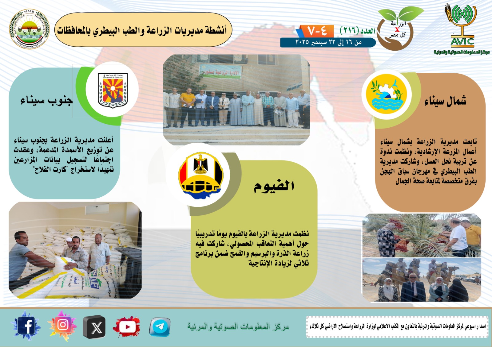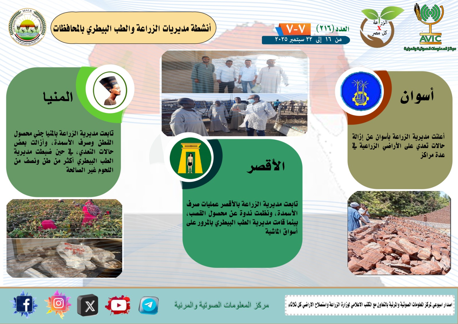 أصدر مركز المعلومات الصوتية والمرئية التابع لوزارة الزراعة واستصلاح الأراضي، والمكتب الاعلامي للوزارة، العدد رقم 216 من اصدار: "الزراعة في كل مصر" بالانفوجراف والفيديو، يوضح الجهود والانشطة التي تقوم بها مديريات الزراعة والطب البيطري بمحافظات الجمهورية خلال الفترة من 16 وحتى 22 سبتمبر الجاري.