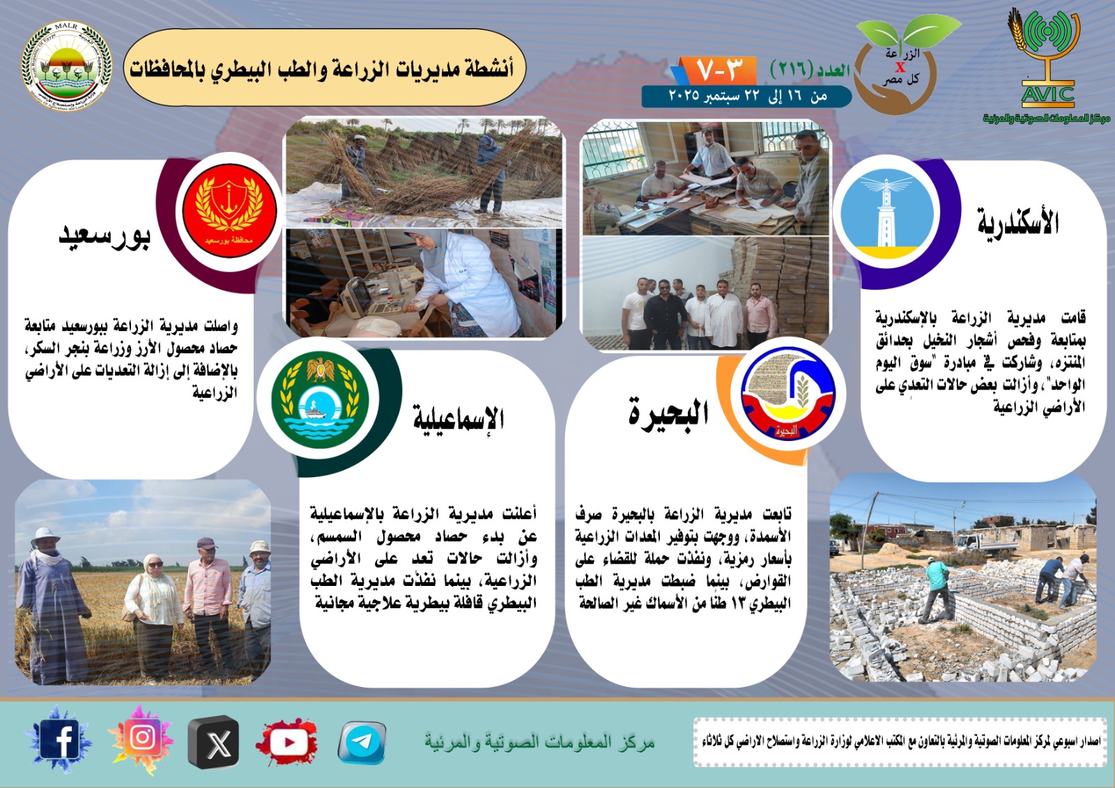 فيما أعلنت مديرية الزراعة بالإسماعيلية عن بدء حصاد محصول السمسم، وأزالت حالات تعدٍ على الأراضي الزراعية، بينما نفذت مديرية الطب البيطري قافلة بيطرية علاجية مجانية، كما واصلت مديرية الزراعة ببورسعيد متابعة حصاد محصول الأرز وزراعة بنجر السكر، بالإضافة إلى إزالة التعديات على الأراضي الزراعية، كما تابعت مديرية الطب البيطري بدمياط لجان التحصين ضد الحمى القلاعية وحمى الوادي المتصدع، ونظمت ندوة إرشادية عن مرض السعار وكيفية الوقاية منه.