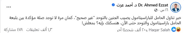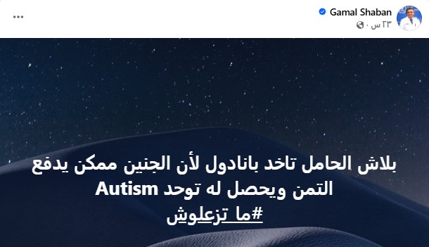 في المقابل، دعا الدكتور جمال شعبان، أستاذ القلب، عبر صفحته على "فيس بوك"، الحوامل إلى تجنب الدواء، قائلاً: "بلاش الحامل تاخد بانادول لأن الجنين ممكن يدفع التمن ويحصل له توحد (Autism)."