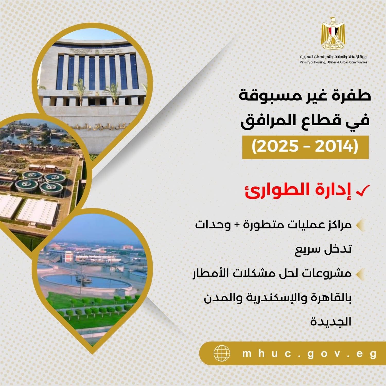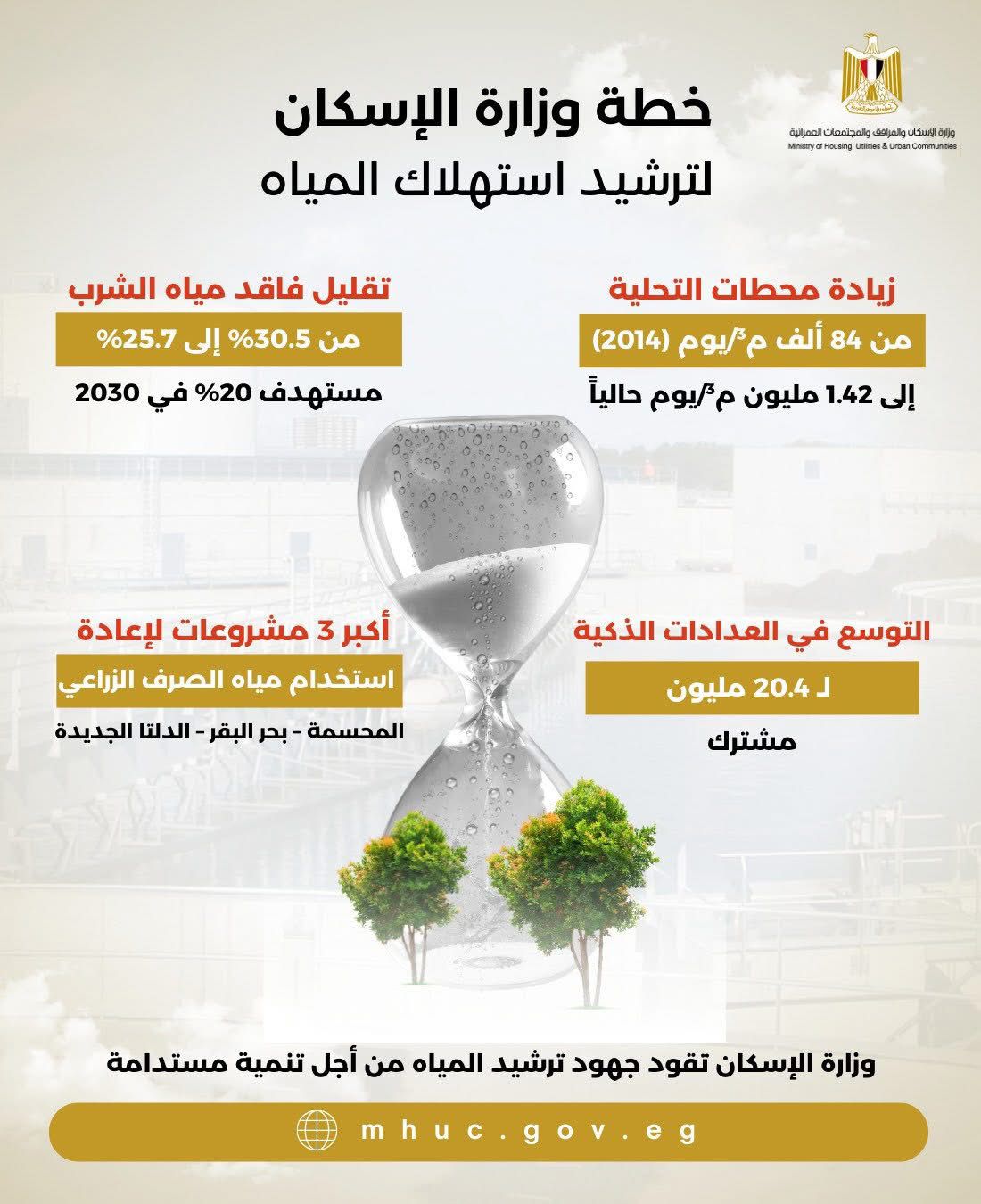 في ضوء توجيهات السيد الرئيس عبد الفتاح السيسي، بضرورة إدارة الموارد المائية بحكمة وتعظيم الاستفادة منها، عملت الدولة المصرية خلال السنوات الماضية على تنفيذ خطة شاملة لترشيد استهلاك المياه وضمان الأمن المائي للأجيال القادمة، وأولت وزارة الإسكان بشكل خاص هذا الملف أهمية قصوى باعتباره أحد ركائز تحقيق التنمية المستدامة، حيث قامت بتنفيذ استراتيجية وطنية تستند إلى محاور متعددة .