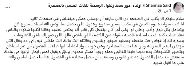 من جانبها سارة قالت رمضان، إحدى أولياء الأمور عبر صفحته “فيسبوك”: "كنت موجودة داخل مكتب المدير يوم الاثنين، ولم أشاهد أي سلاح. الأستاذ ممدوح تعامل معنا بكل احترام، وكل ما أخرجه من الدرج كان فيب وولاعة، وأوضح أنها كانت مع بعض الطلاب وتم التحفظ عليها."