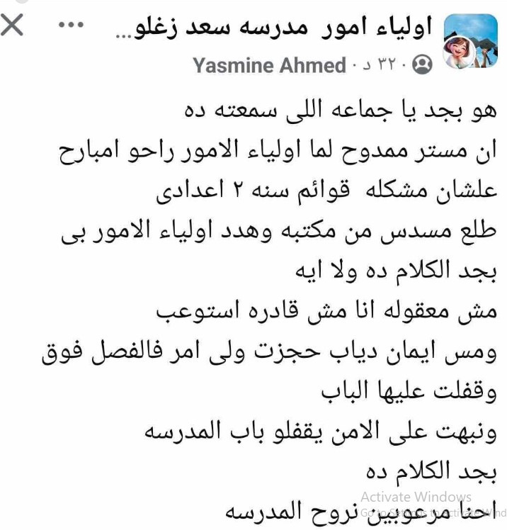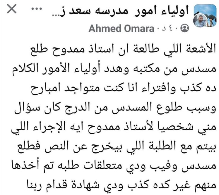 تداول خلال الساعات الماضية، على مواقع التواصل الأجتماعي منشورًا، لأحد أولياء الأمور، يتهم فيه مدير مدرسة سعد زغلول التجربية للغات، بمعصرة حلوان، بقيامه بتهديد أولياء الأمور بإخراج سلاح ناري من مكتبه، ضد أولياء الأمور.