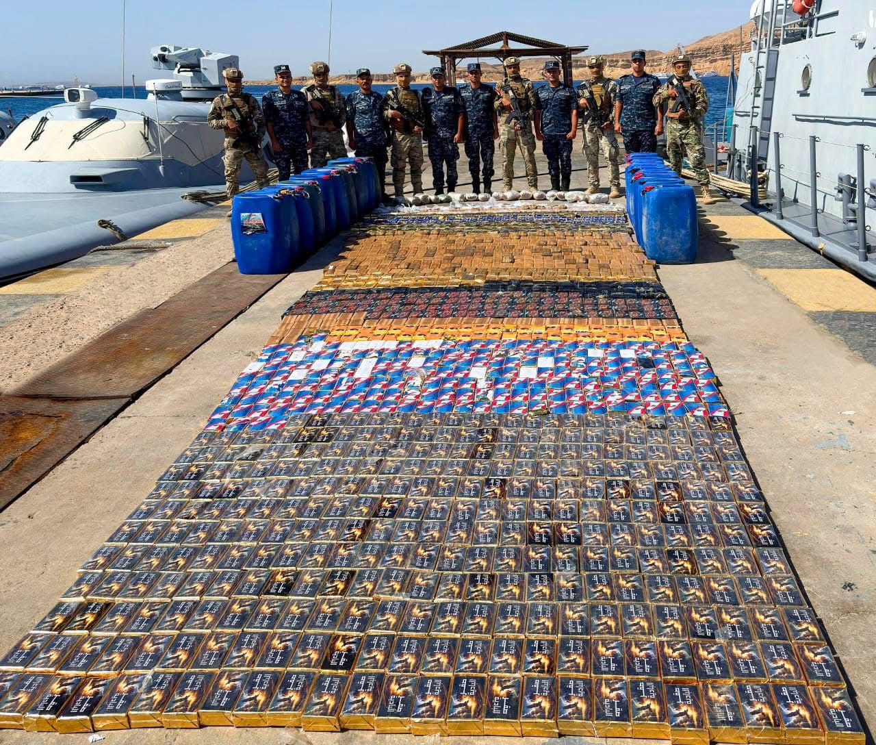 وفى سياق متصل نجحت عدد من الوحدات البحرية فى التصدى لمحاولة تهريب كميات من المواد المخدرة بنطاق الأسطول الجنوبى ، من خلال إكتشاف وضبط عدد ( 1 ) فلوكة على متنها ( 7792 ) فرشاً من مخدر الحشيش و( 17 ) لفافة من مخدر الهيدرو ، وبلغت قيمة كافة المضبوطات ما يقرب من مليار و( 164 ) مليون جنيه بدون الذراعات المخدرة ، وقد تم إحالة المضبوطات إلى جهات الإختصاص لإتخاذ الإجراءات القانونية حيالها .