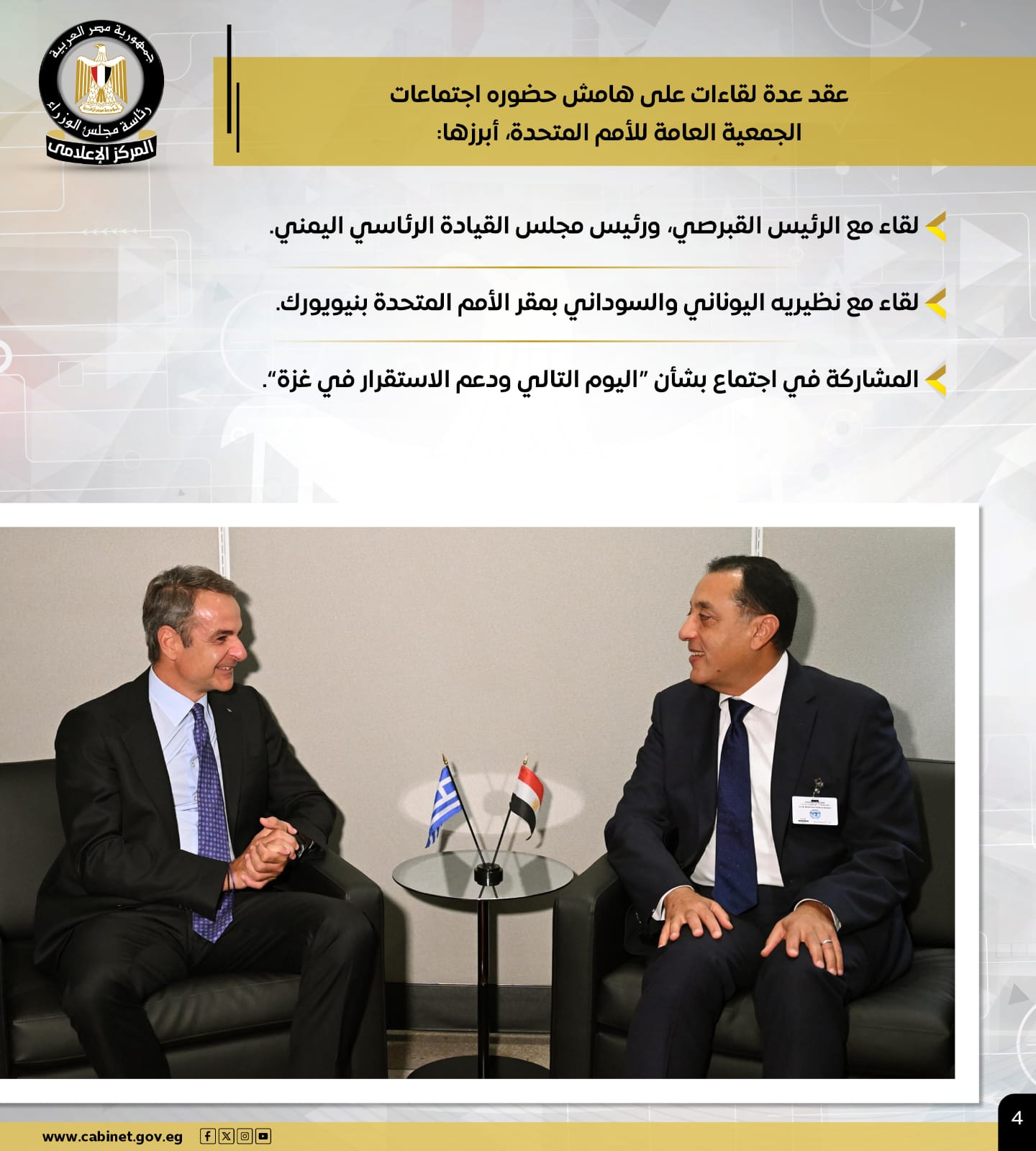 كما عقد سيادته عددًا من اللقاءات على هامش مشاركته اجتماعات الجمعية العامة للأمم المتحدة، أبرزها لقاؤه بالرئيس القبرصي، ورئيس مجلس القيادة الرئاسي اليمني، فضلًا عن لقاءاته مع نظرائه اليوناني والسوداني، بحانب مشاركته في اجتماع بشأن "اليوم التالي ودعم الاستقرار في غزة".