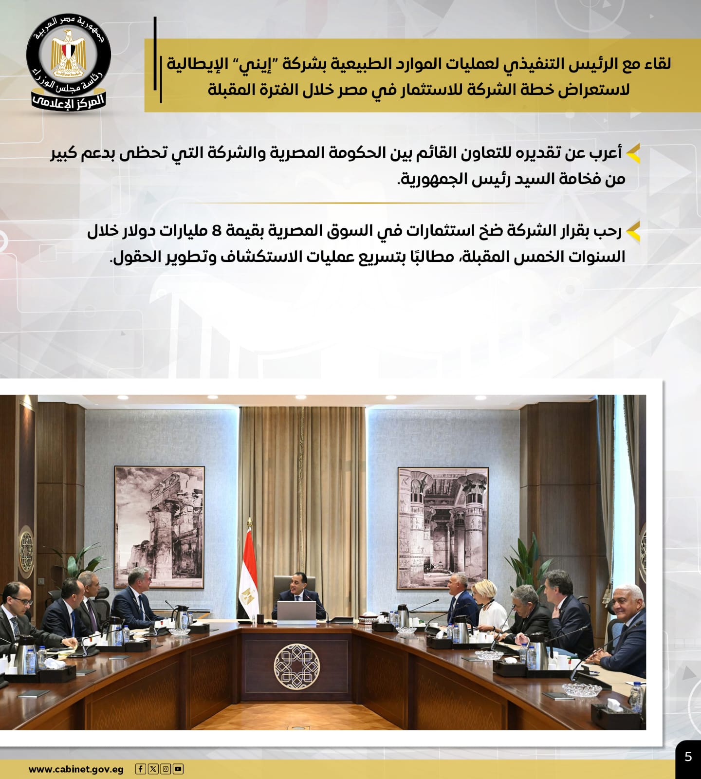 والتقى رئيس الوزراء الرئيس التنفيذي لعمليات الموارد الطبيعية بشركة "إيني" الإيطالية، حيث تم استعراض خطة الشركة للاستثمار في مصر خلال الفترة المقبلة، وأعرب سيادته عن تقديره للتعاون مع الشركة التي تحظى بدعم كبير من فخامة رئيس الجمهورية، ومرحبًا بقرار الشركة بضخ استثمارات جديدة في السوق المصرية بقيمة 8 مليارات دولار خلال السنوات الـ 5 المقبلة، مطالبًا بتسريع عمليات الاستكشاف وتطوير الحقول.