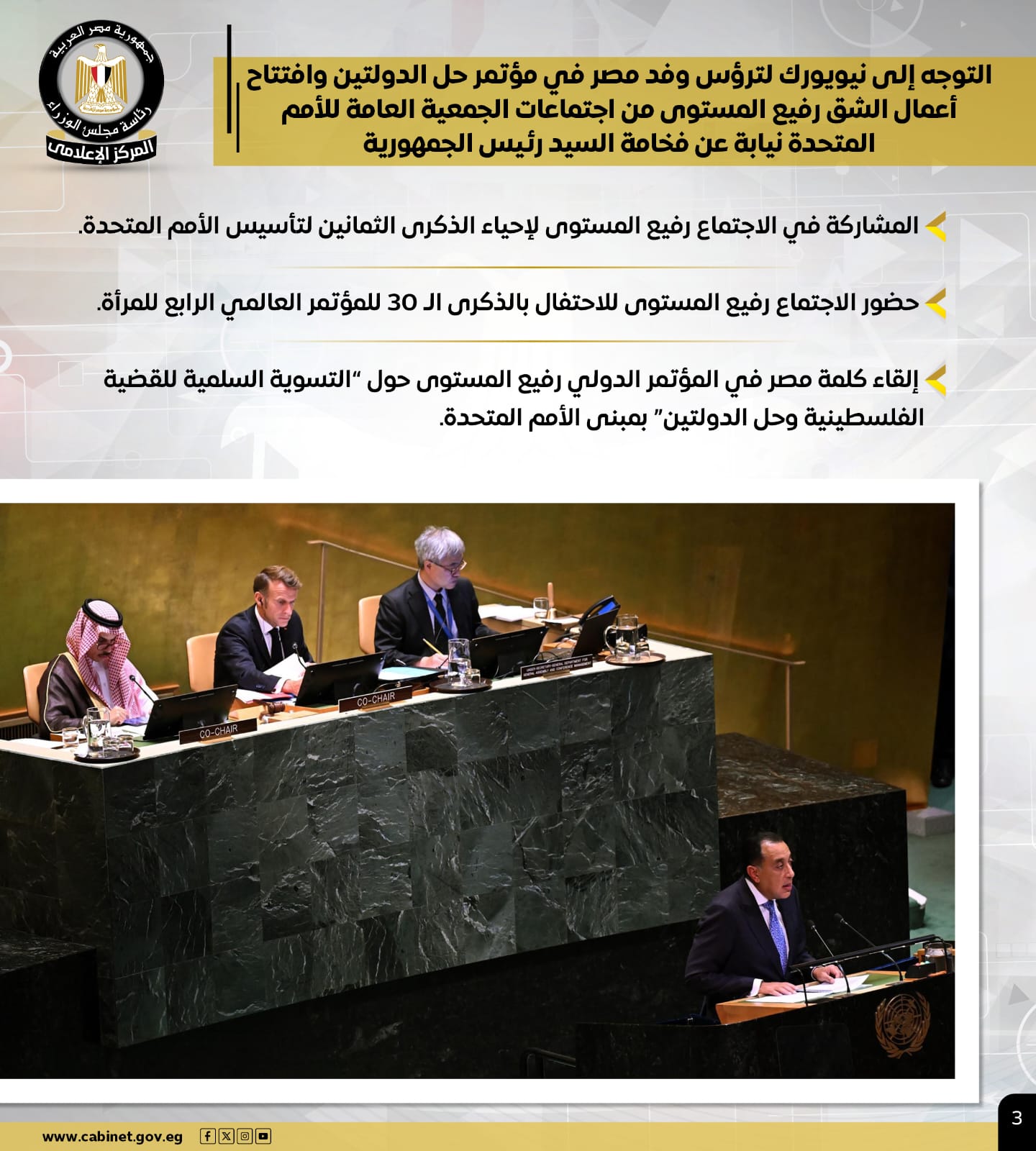 وفي السياق ذاته، شارك سيادته في الاجتماع رفيع المستوى لإحياء الذكرى الـ 80 لتأسيس الأمم المتحدة، إلى جانب حضور فعاليات الاحتفال بالذكرى الـ 30 للمؤتمر العالمي الرابع للمرأة، كما ألقى سيادته كلمة مصر في المؤتمر الدولي رفيع المستوى حول "التسوية السلمية للقضية الفلسطينية وحل الدولتين" بمقر الأمم المتحدة.