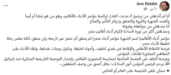 في المقابل، كتب الشاعر عمرو الشيخ عبر صفحته على فيسبوك تعليقًا لافتًا حول ما وصفه بـ "الحنجوري الثقافي" في الجلسة الختامية.