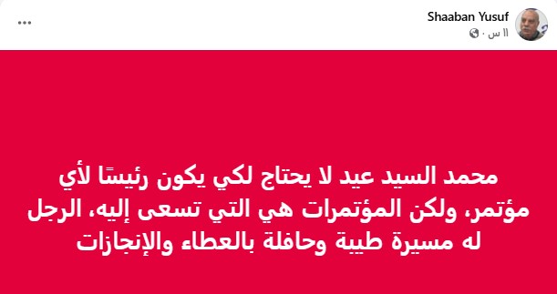 فيما كتب حول الجدل في اختيار رئيساً للمؤتمر أدباء مصر في الأقاليم" محمد السيد عيد لا يحتاج لكي يكون رئيسًا لأي مؤتمر، ولكن المؤتمرات هي التي تسعى إليه، الرجل له مسيرة طيبة وحافلة بالعطاء والإنجازات"
