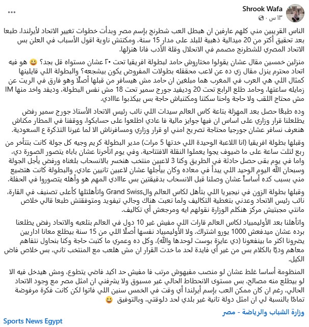 وأضافت في منشورها أنها تعرضت لمواقف متكررة مع الاتحاد جعلتها تفقد الأمل في الإصلاح، من بينها نشر مقالات مسيئة عن اللاعبين، والتعنت في إصدار قرارات وزارية للسفر لبطولات عالمية، فضلًا عن تمييز في معاملة اللاعبين وتأخير متعمد في بعض المباريات لأسباب شخصية، إلى جانب رفض الاتحاد تغطية التكاليف في بطولات دولية رغم الوعود السابقة.