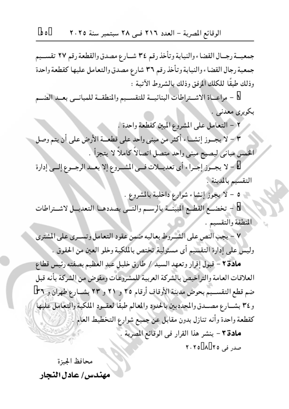 المادة الأولى: يعتمد مشروع تعديل تقسيم الأوقاف، وذلك بضم القطع أرقام 165 تقسيم رجال القضاء والنيابة، وتأخذ رقم 23 شارع طهران، والقطعة رقم 165 مكررًا تقسيم رجال القضاء والنيابة، وتأخذ رقم 21 شارع طهران، والقطعة رقم 167 تقسيم جمعية رجال القضاء والنيابة، وتأخذ رقم 25 شارع طهران، والقطعة رقم 26 تقسيم جمعية رجال القضاء والنيابة، وتأخذ رقم 34 شارع مصدق، والقطعة رقم 27 تقسيم جمعية رجال القضاء والنيابة، وتأخذ رقم 36 شارع مصدق والتعامل عليها كقطعة واحدة، وذلك طبقًا للشروط التالية: