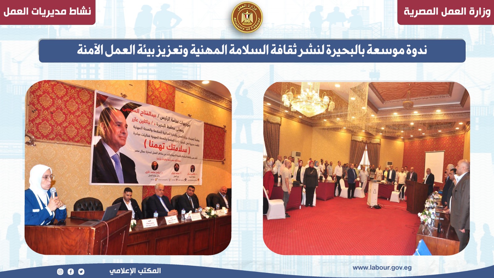 نظمت مديرية العمل بمحافظة البحيرة ندوة توعوية موسعة بعنوان "السلامة والصحة المهنية وحماية بيئة العمل"، وذلك بمجمع دمنهور الثقافي، في إطار تنفيذ توجيهات الوزير محمد جبران وزير العمل، وتحت إشراف الإدارة المركزية للسلامة والصحة المهنية.